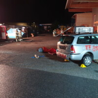 Station 2: Verkehrsunfall – Person von Auto überrollt. Das Fahrzeug musste mittels Hebekissen angehoben werden, um die darunter befindliche Person zu befreien.