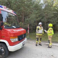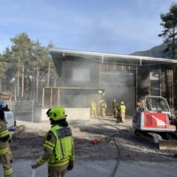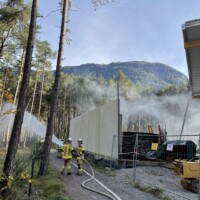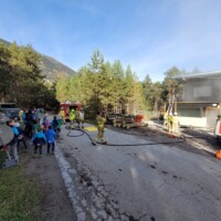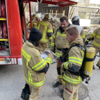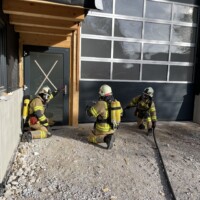 Station 1: Übungsmeldung „Brandgeschehen in der Zimmerei Prantl – 4 Personen werden vermisst“. Bei dieser Station ging es speziell um die Bergung der vermissten Personen aus dem Gebäude, den Innenangriff unter Atemschutz sowie den Aufbau eines Objektschutzes.