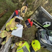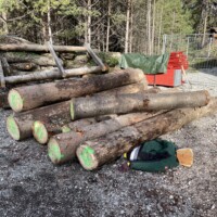 Station 2: Übungsmeldung „Eingeklemmte Person unter Baumstamm“. Die betroffene Person (Übungspuppe) wurde beim Umladen von einem Baumstamm eingeklemmt. Der Baumstamm musste mittels Hebekissen angehoben werden, um die darunter befindliche Person zu befreien.