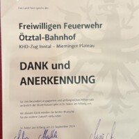 Am Sonntagabend, den 22.September, nahmen unser Kommandant und unser Kommandant-Stv. stellvertretend für unsere Einsatzmannschaft, die gemeinsam mit dem KAT-Zug Inntal-Mieming am Katastropheneinsatz in St.Christoph ausrückte um die betroffenen der Unwetterereignissen vom 16.August 2024 zu unterstützen, an der Dankes-Veranstaltung mit anschließender Urkundenübergabe durch das Land Tirol teil.